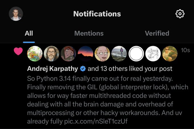 Andrej Karpathy 也在 X 上点赞这个贴文,就像是一记注脚:这一次,Python 的并发故事真的开始加速了。