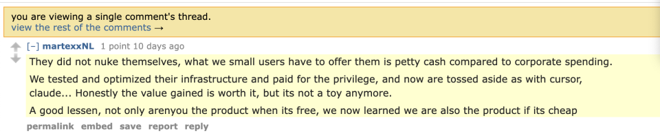 “且不说产品问题频发、客服部门的回应始终敷衍,就连用户提出终止合同也毫无反馈;再加上如今各类 AI 代理工具层出不穷、选择越来越多 —— 种种因素叠加下,他们先前积累的所有好感、以及旧套餐攒下的口碑,全都被自己如今的操作毁得一干二净,简直是搬起石头砸自己的脚。”