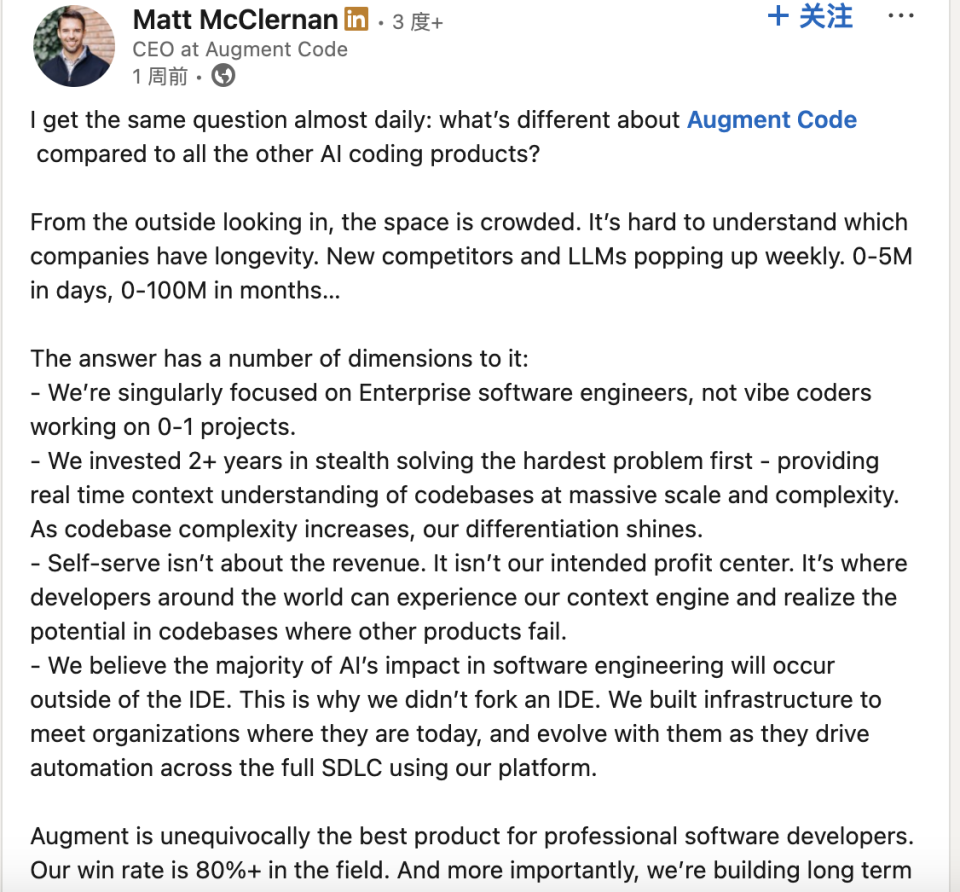 在确定定价变更的几天后,McClernan 在领英上发帖称,这个领域竞争非常激烈,但 Augment 在市场中的赢单率超过 80%。