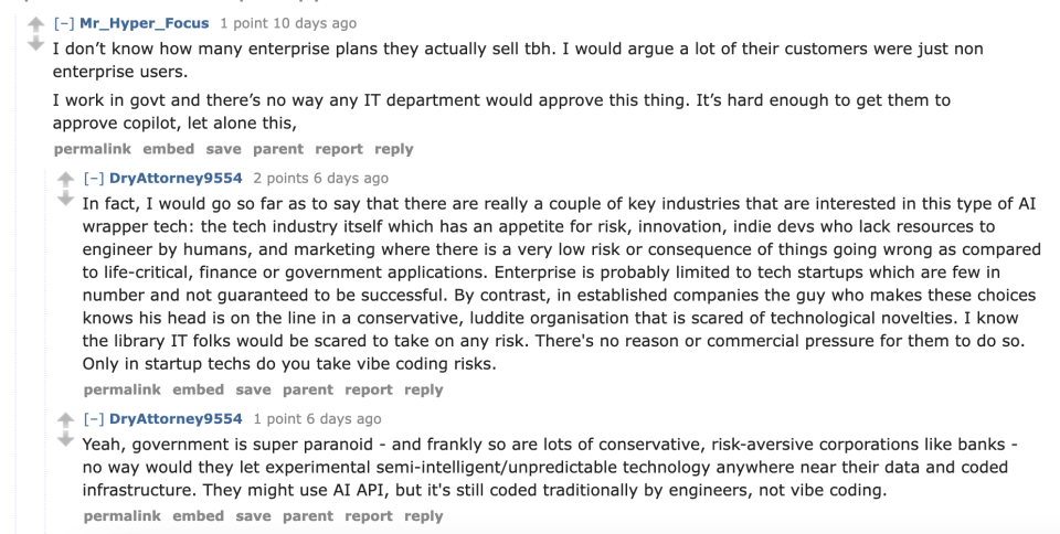 在该用户帖子下方,有人回应猜测 Augment 可能并没有特别多的企业用户,因为很多企业不会批准员工使用 Augment Code 这类 AI 编码工具。