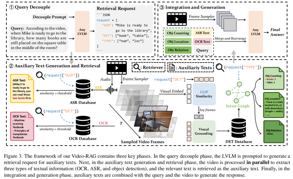 将用户问题自动拆解为多个检索请求(JSON 格式),指导系统从不同模态数据库中查找相关信息,LVLM 此阶段仅处理文本,不接触视频帧,大幅降低初期计算负担。