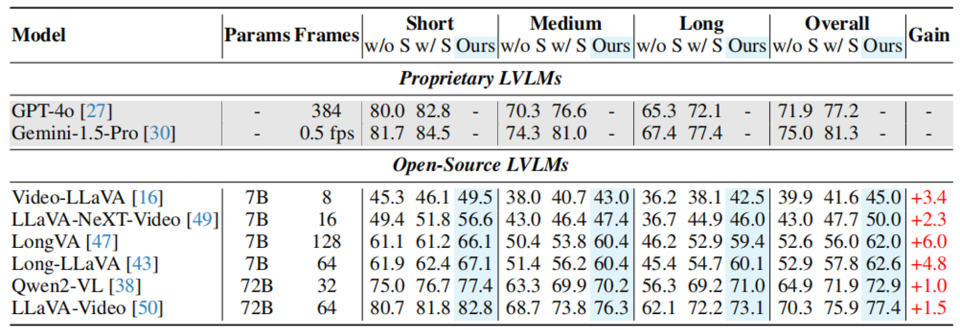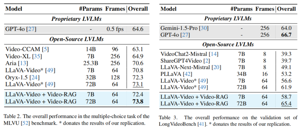 性能领先:当与一个 72B 参数规模的开源 LVLM 结合时,Video-RAG 在多个长视频理解基准上超越 GPT-4o 和 Gemini 1.5 等商业闭源模型,展现出惊人的竞争力。