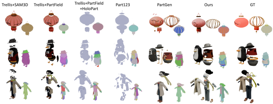 如下图所示,与 Part123、PartGen 等现有方法相比,OmniPart 生成的3D部件在几何细节、语义准确性和结构一致性上都表现出明显优势。其他方法或只能生成表面分割,或几何质量较差,而 OmniPart 则能生成结构完整、细节丰富且能完美组合的独立部件。