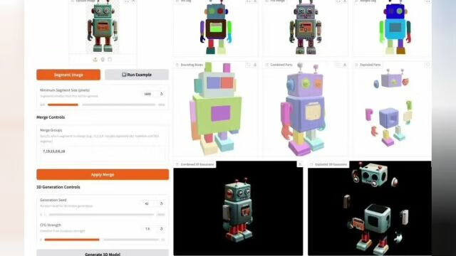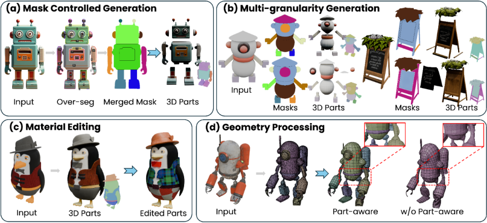掩码控制生成 (Mask-Controlled Generation):用户可通过编辑2D掩码,精确指导3D部件的结构生成。