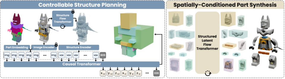 OmniPart 的流程优雅而高效,它将复杂的部件生成任务分解为两个核心模块:可控的结构规划(Controllable Structure Planning)和空间感知的部件生成(Spatially-Conditioned Part Synthesis)。
