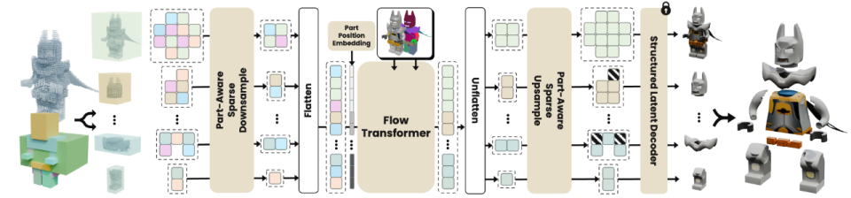 该模块基于一个强大的预训练3D整体生成器(TRELLIS)进行高效微调。它将所有部件的潜在编码(latent codes)进行并行联合优化,而不是孤立地生成每个部件。这种全局与局部信息结合的去噪过程,确保了最终部件之间的高度一致性。