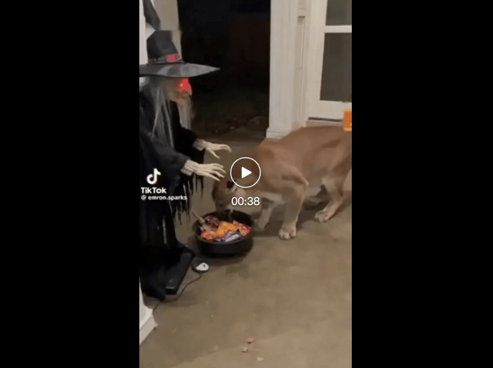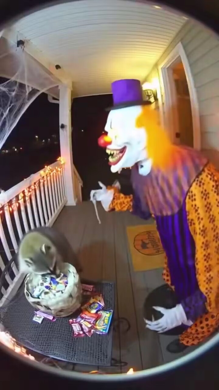 除此之外,最近国外还流行起另一种 AI 视频 —— 万圣节小丑装饰吓偷吃糖果的动物。