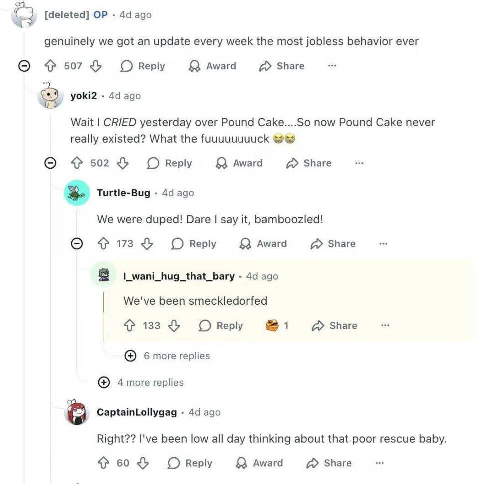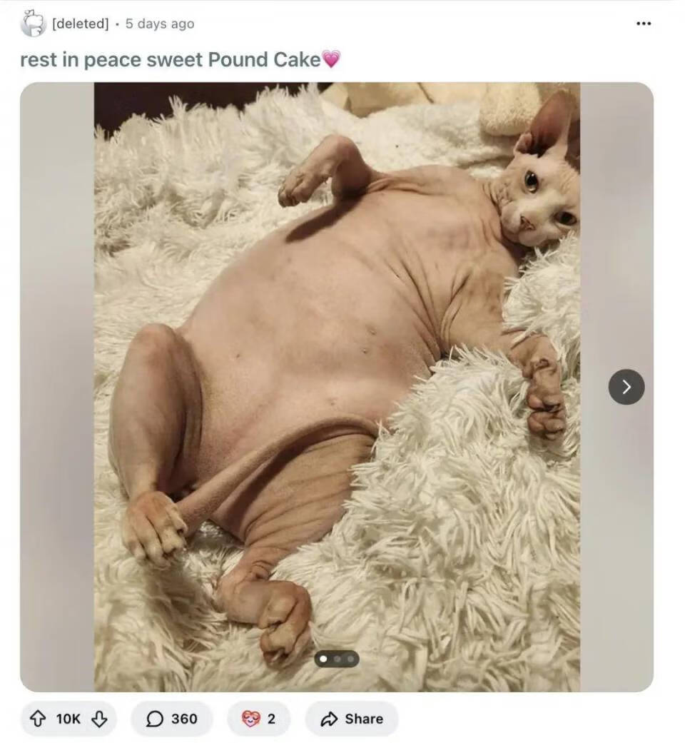 事情的起因是 Reddit 一楼主发帖称收养了一只肥胖的斯芬克斯猫,并每周发布它的减肥过程,吸引了不少粉丝关注,当 Pound Cake 突然「去世」时,有粉丝们还为其大哭了一场。