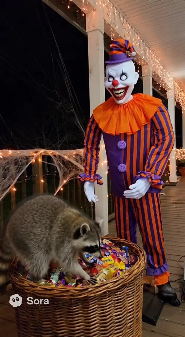 (一个夜晚的门廊,装饰着万圣节的蜘蛛网和橙色灯串。一只浣熊正在一个装满糖果的篮子里翻找糖果,一个穿着橙色和紫色条纹服装的动画小丑站在旁边,动作显得机械化和夸张,脸上带着夸张的笑容,嘴里说着「Trick or treat!Come closer and I'll give you a real...」的台词。浣熊突然转身,猛烈地攻击小丑,小丑被撞翻在地后,浣熊逃走。整个场景充满了幽默和惊奇的氛围,展现了浣熊对万圣节装饰的反应。)