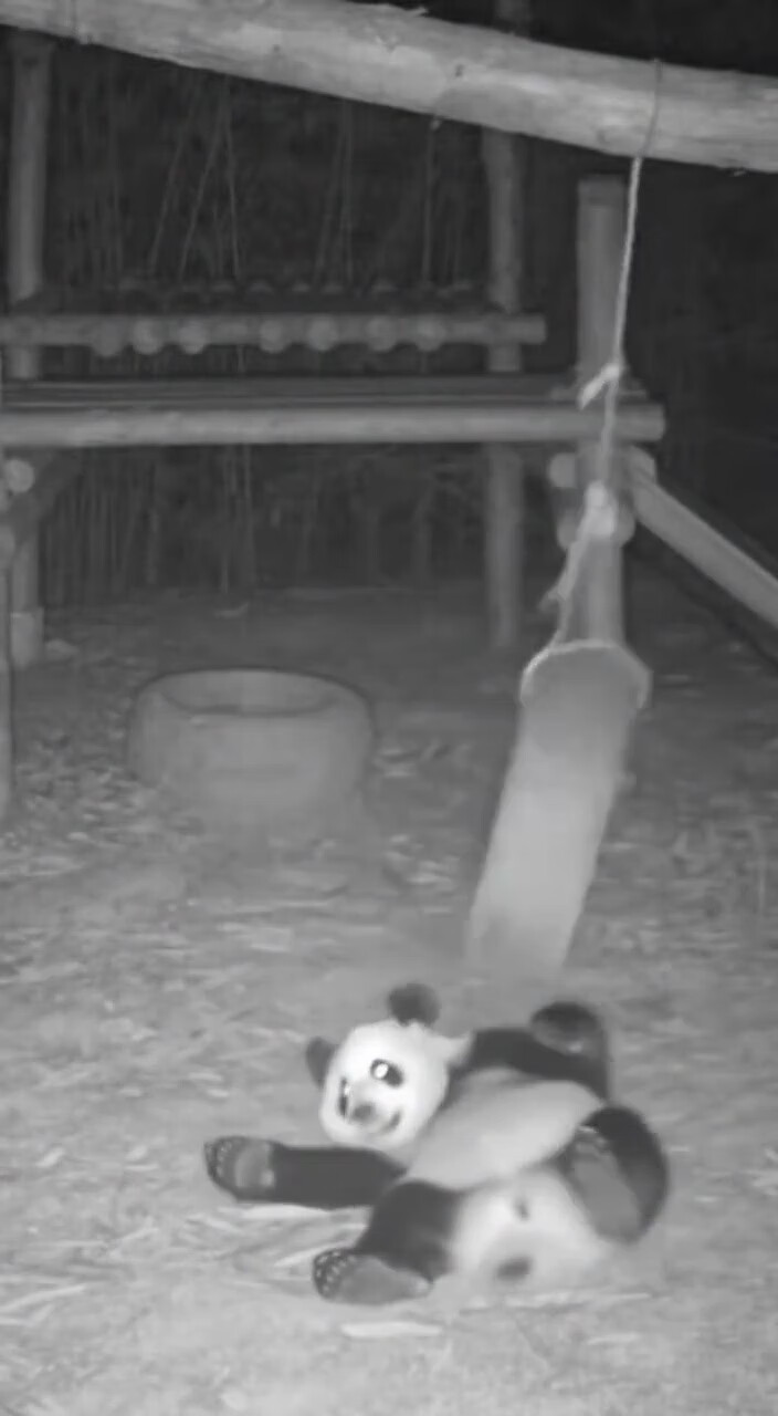 仍旧是红外监控视频,一只大熊猫正踩在轮胎上荡秋千,突然绳子断裂熊猫摔了个屁股墩儿,本来都准备摆烂躺平了,这时轮胎砸过来又给它薅起来,整个情景很是呆萌有趣。
