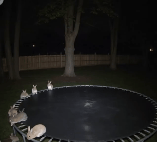 黑灯瞎火的后院中,监控视角下忽现一群兔子玩蹦蹦床,如果不是其中一只兔子凭空消失,大概很多人都无法分辨出这是 AI 的手笔吧。