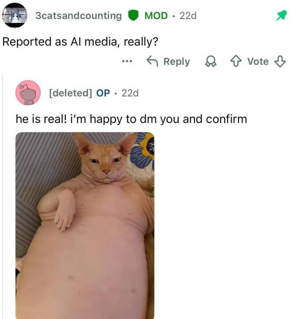 换句话说,它根本不是一只真实的猫,楼主只是偷拿了别人用 AI 生成的图片。粉丝们大呼被骗感情。