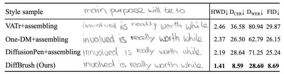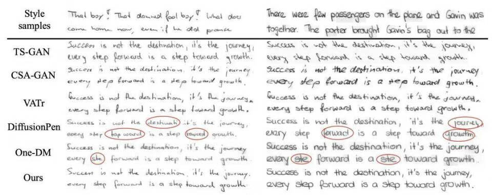在英文文本行生成任务中,相比之前的各种方法, DiffBrush 生成的文本行在字符倾斜度、墨迹深浅、笔画宽度等方面更接近参考样本。对于同样使用了扩散方法的 DiffusionPen 和 One-DM,红圈部分显示了其生成结果的缺失字符或结构错误。