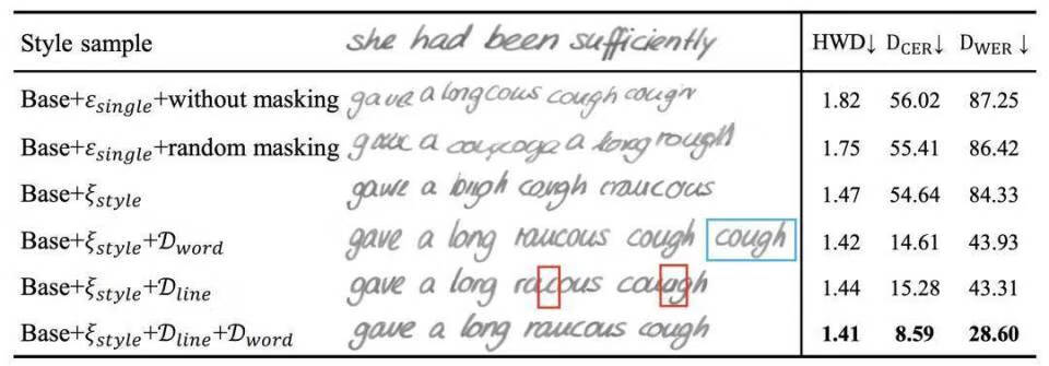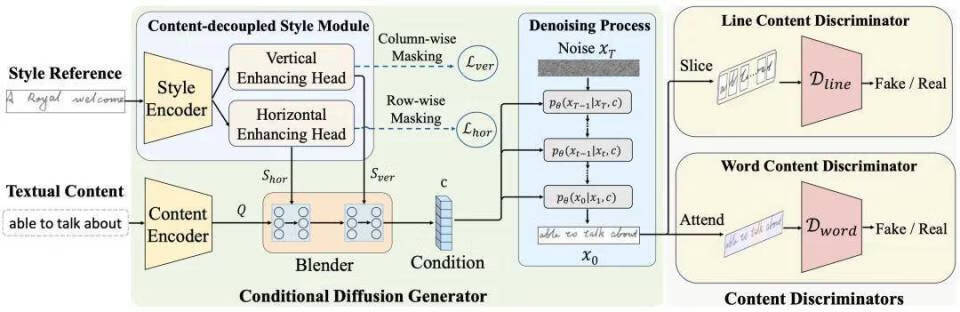 最后,多尺度内容判别器在行级监督字符顺序和基线连贯性,在词级判别字符结构真伪,最终生成风格一致、基线齐整、词距自然的手写体文本行。