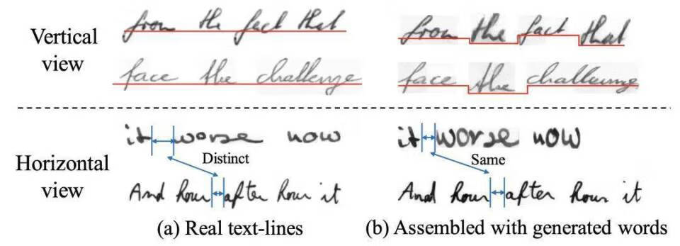此外,生成字符再合成文本行的做法使得字符间距趋于一致,然而真实笔迹的字符间距往往是富于变化的,并且这些变化也可视为书写者风格的一部分。