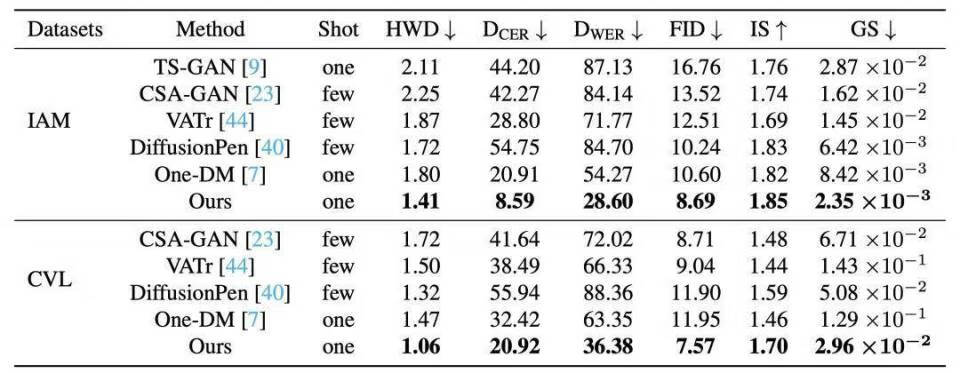 DiffBrush 在英文、中文等数据集上都取得了超过现有方法的优越性能。值得注意的是,在同样使用一张参考样本的情况下,DiffBrush 在各项指标上相较于 One-DM 均有较大提升,且显著优于其他使用多张参考样本的方法。