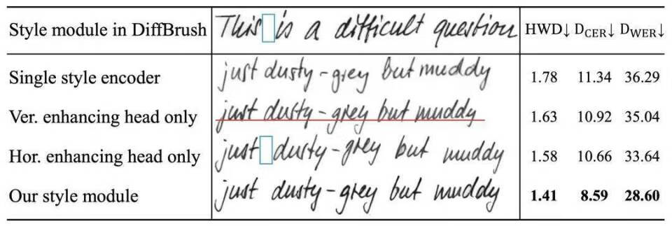 如下表所示,DiffBrush 的内容解耦的风格模块与多尺度内容判别模块存在协同效应。相较于无掩码和随机掩码,论文提出的「列掩码 + 行掩码」的方法更佳。尤其重要的是,多尺度内容判别模块在不影响 HWD 风格指标(甚至更好)的情况下,显著降低了字符错误率。