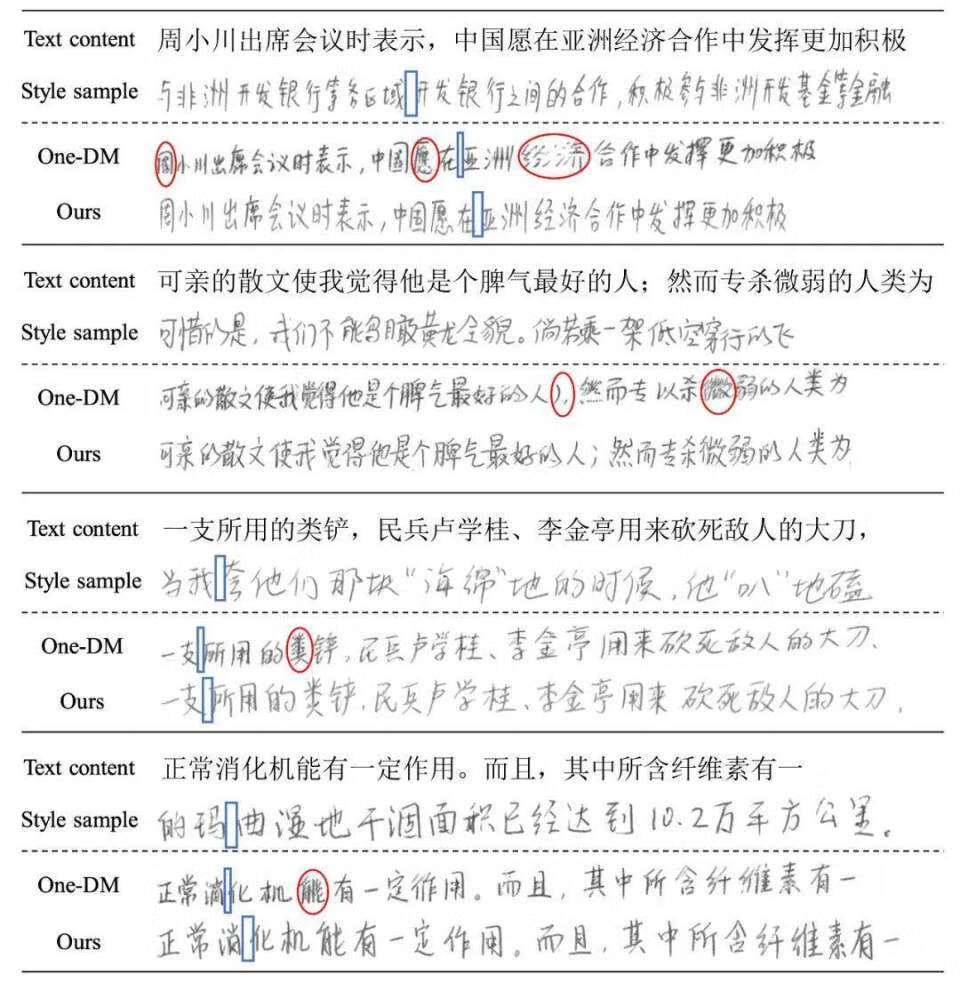 而在字符结构更复杂的中文文本行生成任务中,与 One-DM 方法相比, DiffBrush 生成的手写体文本行也表现出与参考样本最相似的样式,尤其在字符间距和墨水颜色方面。同时 DiffBrush 能生成更加准确的字符结构。