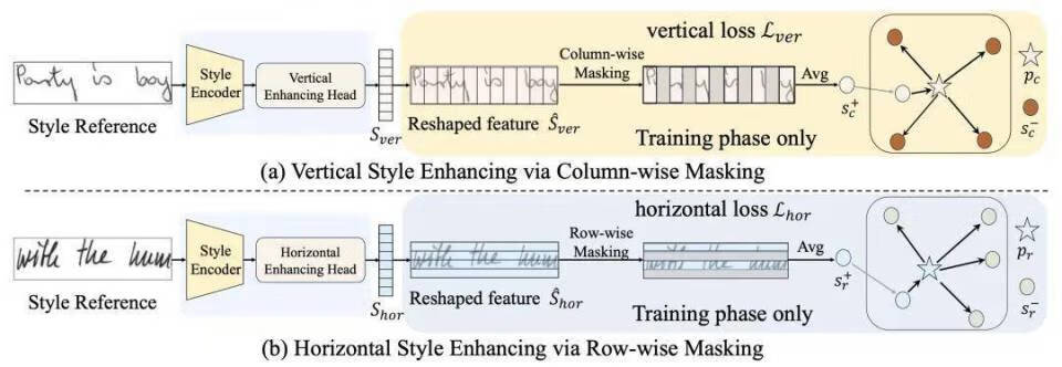 首先,将手写样本送入 CNN-Transformer 风格编码器,通过列向掩码与行向掩码分别增强垂直方向和水平方向的风格学习,经 Proxy-NCA 对比学习后输出垂直增强特征与水平增强特征。