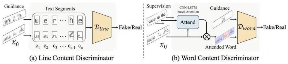 (b) 多尺度内容判别模块。长文本生成容易在局部字符中出现错误,为兼顾全局字符顺序与局部字符结构的准确性,DiffBrush 构建了一个多尺度内容判别模块,包括行级判别模块 D_line 和词级判别模块 D_word。