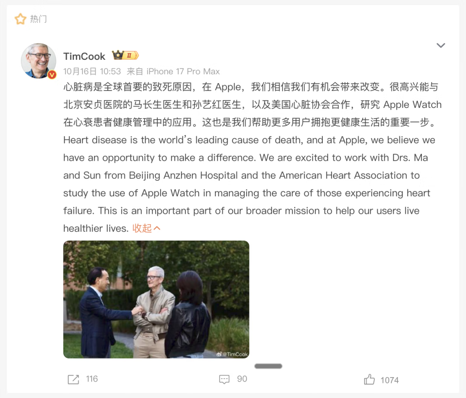 10 月 17 日消息,苹果 CEO 库克的本次中国行还在继续中,昨日在北京宣布,与北京安贞医院和美国心脏学会联合,启动一项研究项目,重点探究如何利用 Apple Watch 监测合并房颤的心力衰竭患者病情,以求更早发现病情恶化征兆。