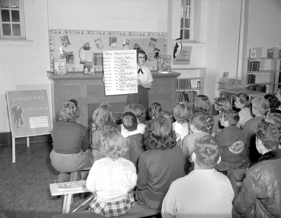 20 世纪 60 年代,在加拿大阿尔伯塔省埃德蒙顿的一家图书馆里,孩子们正在学习杜威十进制分类法|图片来源:Wikipedia