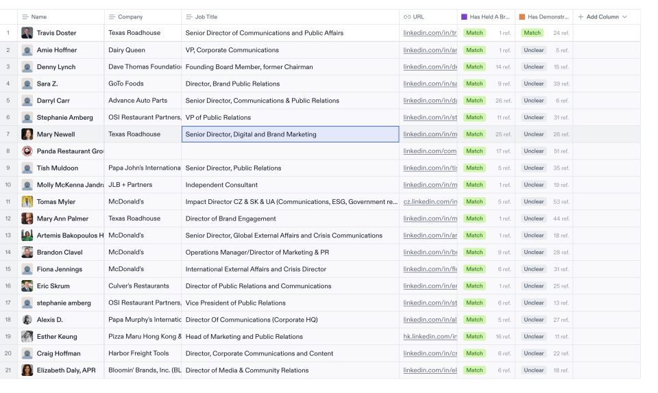 对于条件一,系统准确地从公开信息中找到了在德州公路扒房(Texas Roadhouse)、麦当劳(McDonald's)、棒约翰(Papa John's)等大型餐饮连锁集团中,担任「高级公关总监」、「企业传播副总裁」等符合条件的高管。这部分任务,它完成得相当精确。