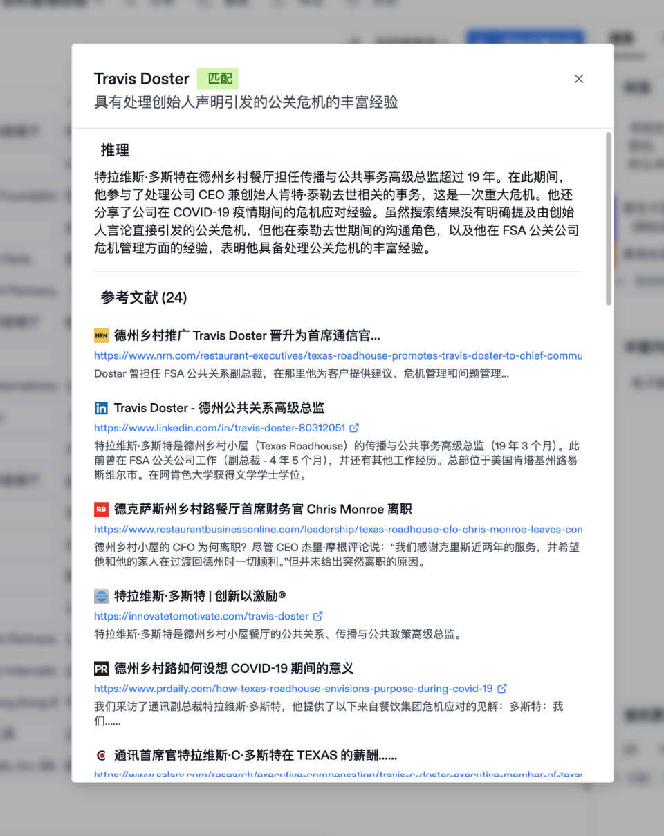 条件二就颇有一些难度,因为「处理创始人个人言论引发的公关危机经验」是一个相对难验证的事情。系统并没有给出简单的「是」或「否」。相反,它在右侧生成了额外的验证列,并给出了「Match」(匹配)或「Unclear」(不明确)的标注。