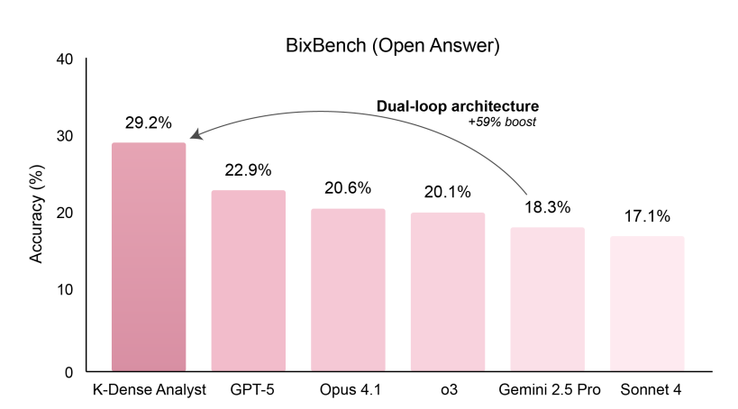 在BixBench这个最严格的生物信息学测试中,K-Dense Analyst拿到29.2%的准确率,超过GPT-5的22.9%,也远高于底层模型Gemini 2.5 Pro的18.3%。