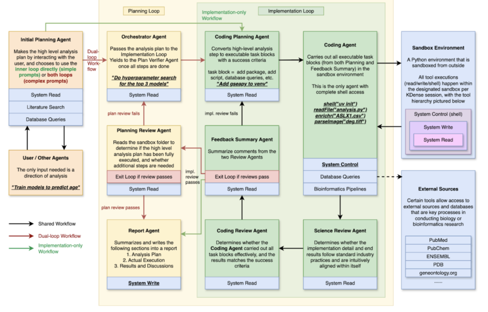 图 K-Dense Analyst的「双环架构」(dual-loop architecture)。外层规划环(Planning Loop)负责整体科研策略,内层执行环(Implementation Loop)将任务拆解为可验证的代码与分析,并在沙箱环境中运行。