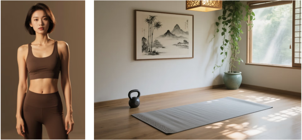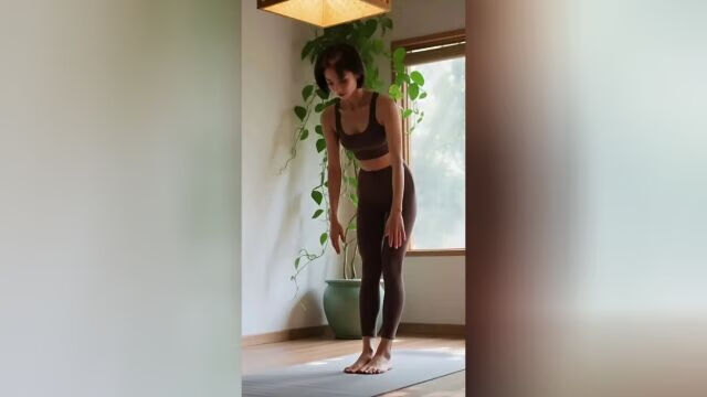 提示词:[@短发瑜伽女孩]在房间[@图1]中的瑜伽垫上,身体摆放着前屈式瑜伽动作,慢慢的抬起腿,人物呈现倒立的瑜伽姿势