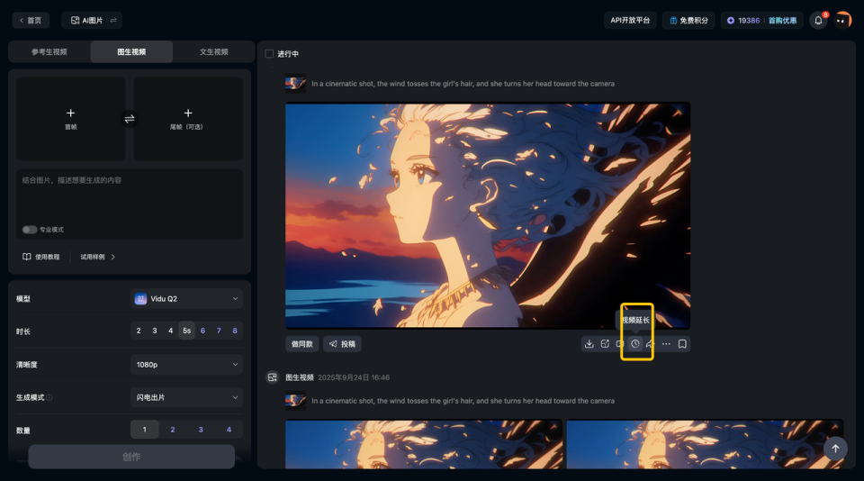 · 选择已生成的视频,点击延长功能,节选视频片段进行延长;