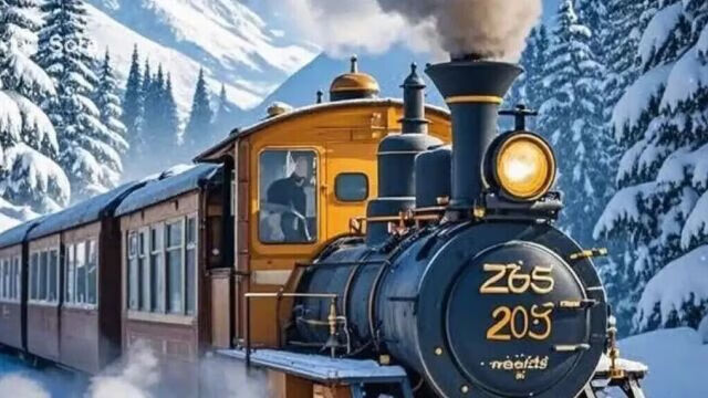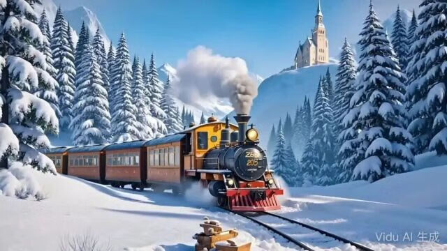 prompt:火车运动起来,车头被逐步放大,烟囱不断冒出,松树逐渐变小。 要求: 1.相机运动:向右跟随