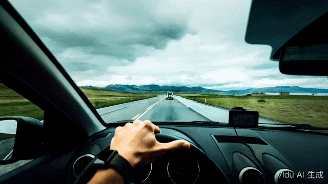 上传一张主驾驶的第一视角图,然后交给Vidu让其以固定镜头,生成一个汽车在路面行驶的视频。