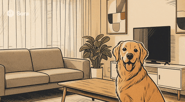 prompt:In a living room, a dog crouches on the floor;Shot 2: Close-up — the dog looks expectant, poised to jump.; Shot 3: The dog leaps onto the sofa.