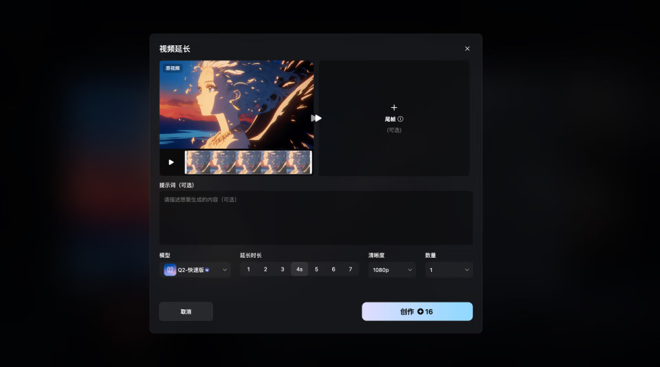 · 或者上传图片延长至尾帧,输入提示词,选择需要延长的秒数(每次支持1-7秒延长),即可进行视频延长创作。