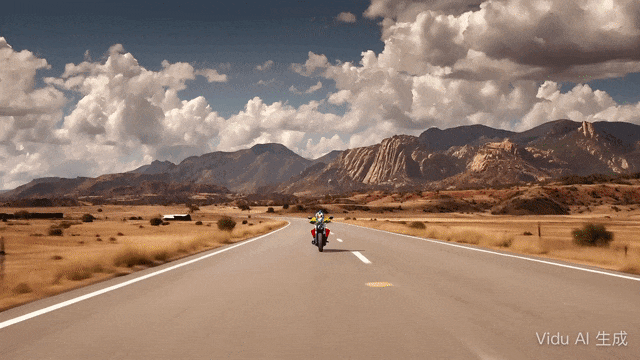 提示词:@图3孙悟空骑着@图1摩托车,在@图2公路上飞驰。镜头从远景逐渐切至近景,最后落在人物面部。镜头固定后,人物骑着摩托车逐渐远去