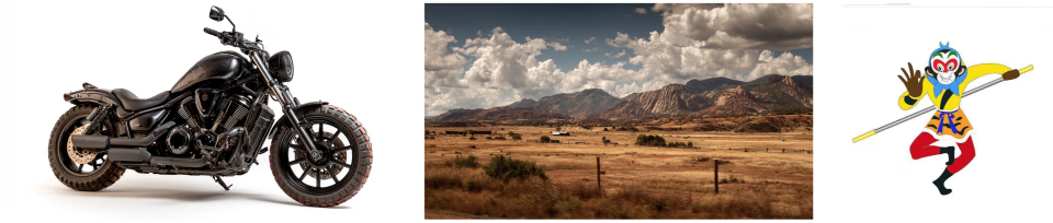 比如,参考图孙悟空、摩托车和自然背景,让孙大圣在原野上飞驰: