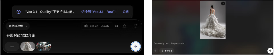 Veo 3.1 Quality不支持;Sora 2/Pro目前仅支持上传一张图片