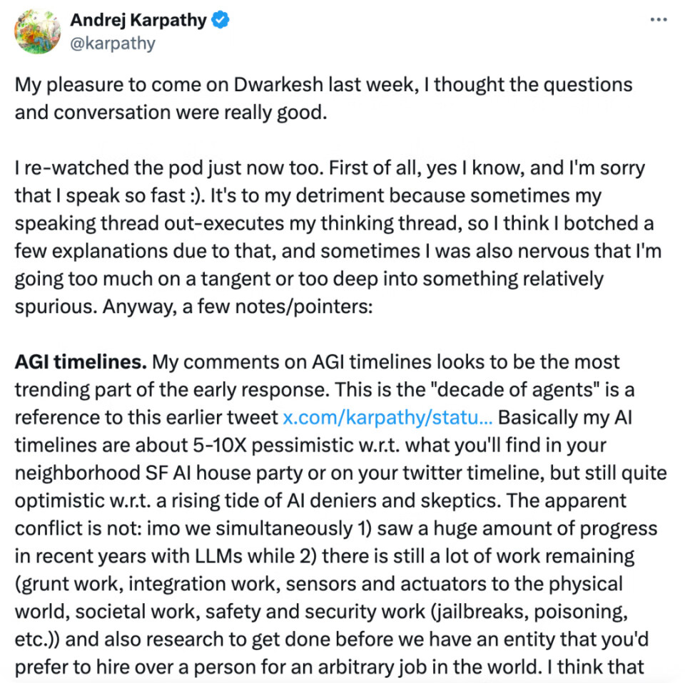 但这并不代表 Karpathy 正在唱衰 AGI 的未来,相反,他想强调人类确实在过去几年里取得了 LLM 带来的惊人进展,但距离能在任意岗位上取代人类的通用智能,仍有漫长的系统集成与现实约束需要克服,包括对物理世界的感知、执行、社会协调、安全与防护等层面。