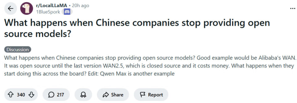 美国 AI 圈开始出现“担心中国开源断供”的苗头了吗?10 月 20 日,在专注于开源模型讨论、拥有 55 万成员的 Reddit 分论坛“r/LocalLLaMA”上,一位网友发布了一则“当中国公司停止提供开源模型时会发生什么?”的提问,并表达了假如中国模型逐渐闭源或开始收费该怎么办的担忧。