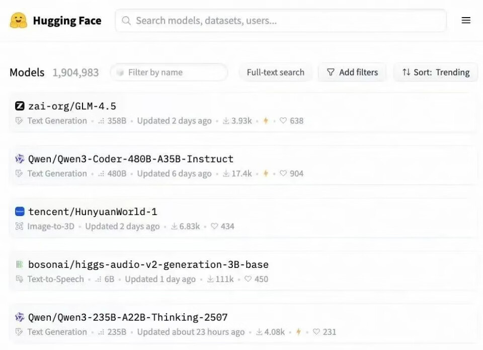 2025 年 7 月 30 日,在 Hugging Face 的开源模型榜单前 10 名中有 9 个来自于中国,这 9 个大模型分别属于智谱、阿里通义、腾讯混元、月之暗面;就这一榜单的前 5 名来说,当时除了第 4 名,其余几名全部是中国大模型。其中,智谱 AI 的开源模型 GLM-4.5 模型发布之后迅速冲上榜单前列,而这款模型正是前面提到的郁家豪所使用的国产大模型。