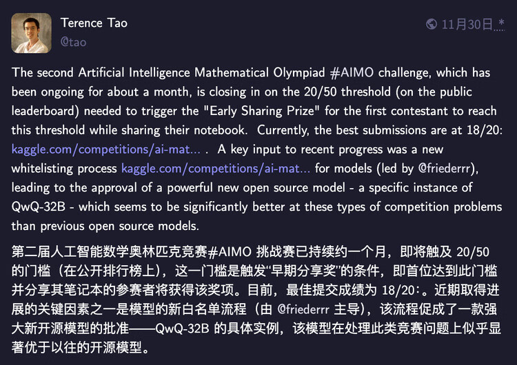 同样是在 2024 年末,国际数学大牛陶哲轩也曾在 X 公开表达过对于 Qwen 模型的认可。