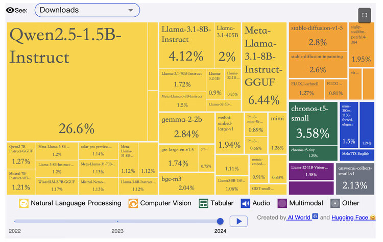 2024 年年末,Hugging Face 的数据显示,Qwen2.5-1.5B-Instruct 当年的下载量占比达到 26.6%,均超过 Llama 3 和 Gemma 这些明星开源模型,网友还为此制作了“扎克伯格看着你使用 Qwen 而非 LLaMA”的梗图。