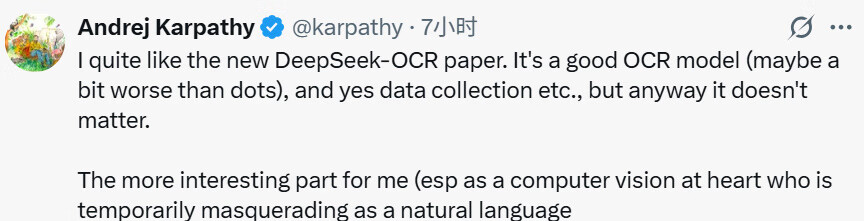而就在昨天,DeepSeek 发表了关于 OCR 的新论文,该论文得到了 OpenAI 联合创始成员之一、前特斯拉自动驾驶总监安德烈·卡帕西(Andrej Karpathy)的盛赞,他在 X 上写道:“我很喜欢 DeepSeek-OCR 的新论文,这是一个很好的 OCR 模型。”