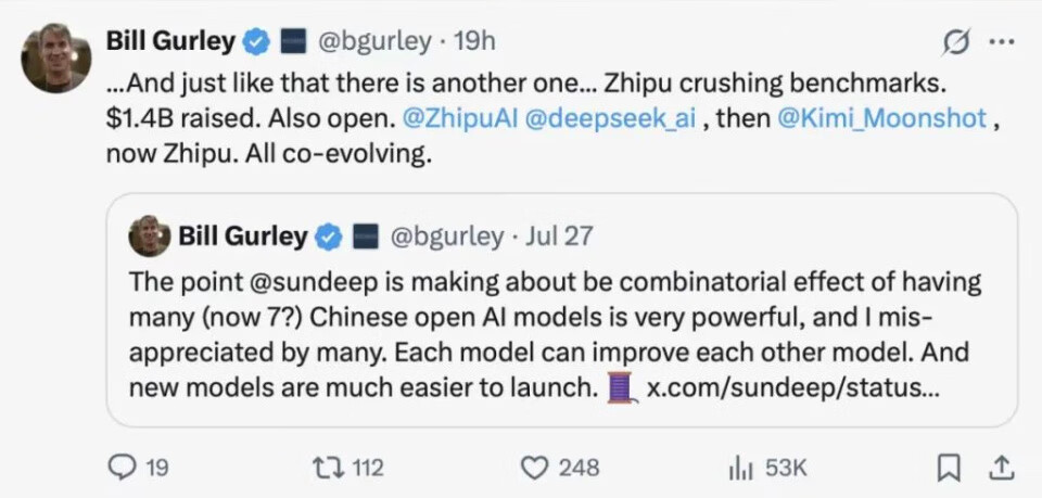 同样是在 2025 年 7 月,美国硅谷风投公司 Benchmark 合伙人比尔·古尔利(Bill Gurley)在 X 写道,中国开源模型所产生的组合效应非常强大,模型之间可以互相学习,新模型的推出也更容易。