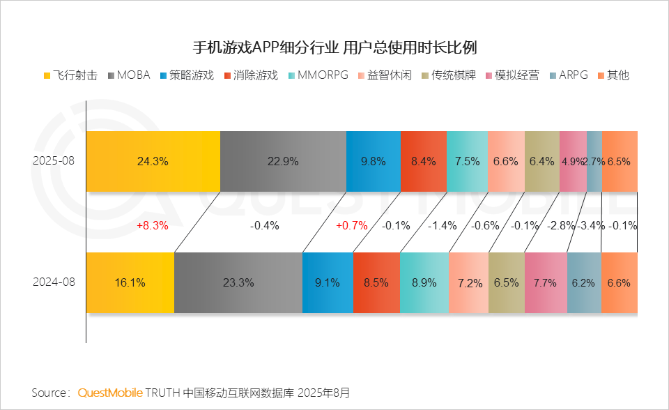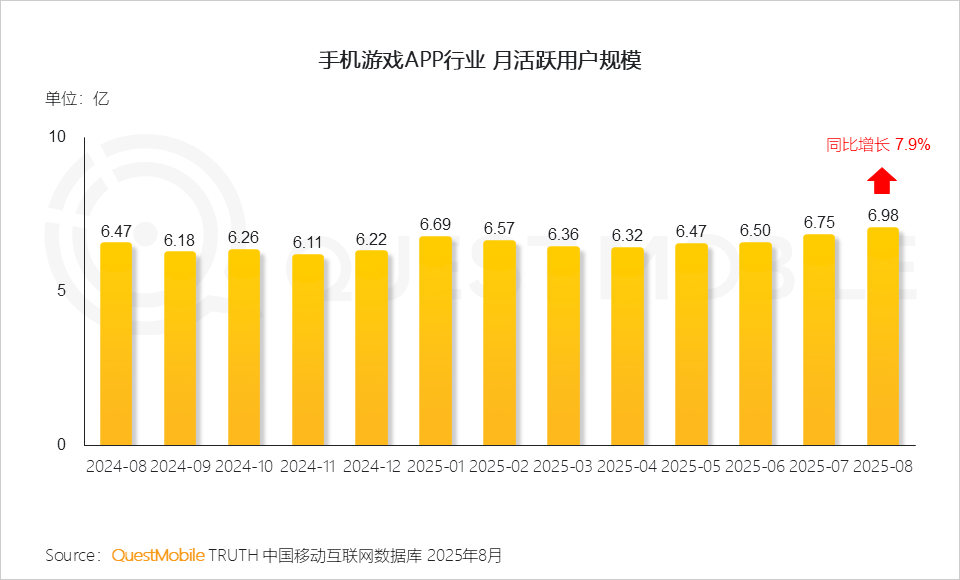 QuestMobile数据显示,截止到2025年8月,手机游戏APP行业月活用户规模达到6.98亿,同比增长了7.9%,人均单日使用次数和时长分别达到23次、114.4分钟,抢占了用户深度沉浸式娱乐时间;同时,微信小游戏、抖音小游戏月活用户规模分别达到5.71亿、1.71亿,成功抢占了用户的碎片化时间。