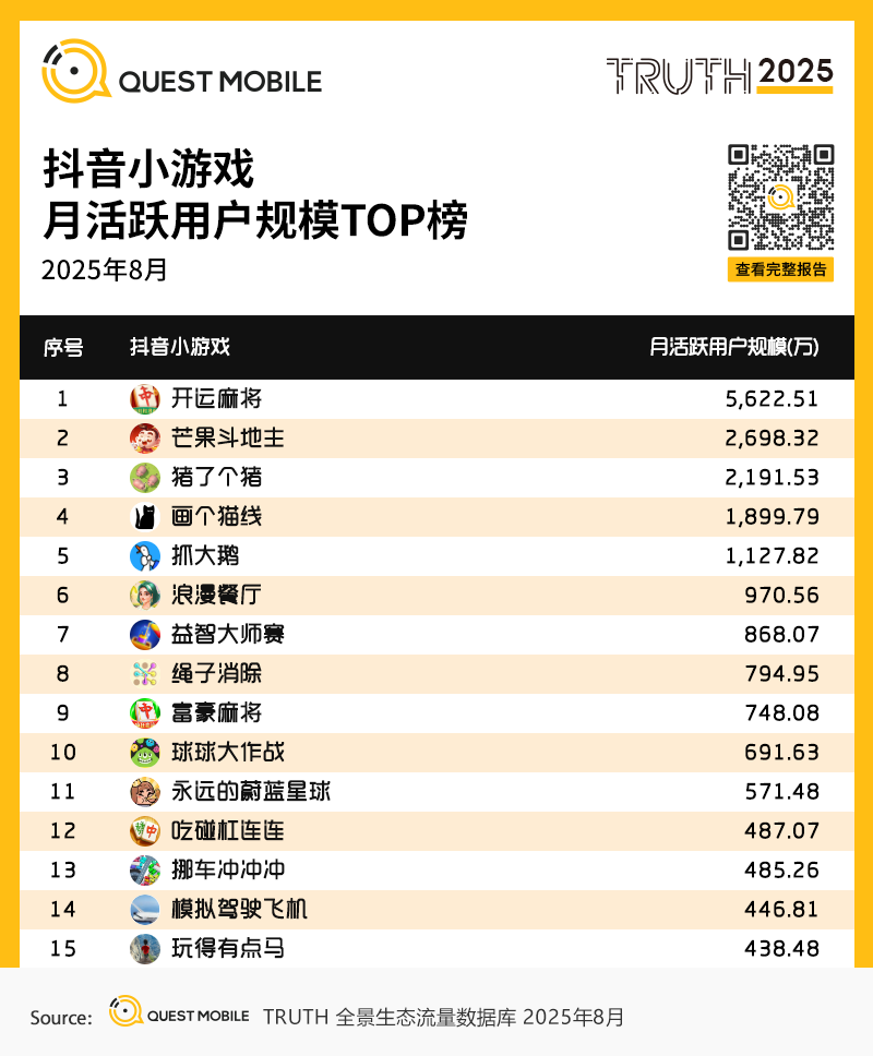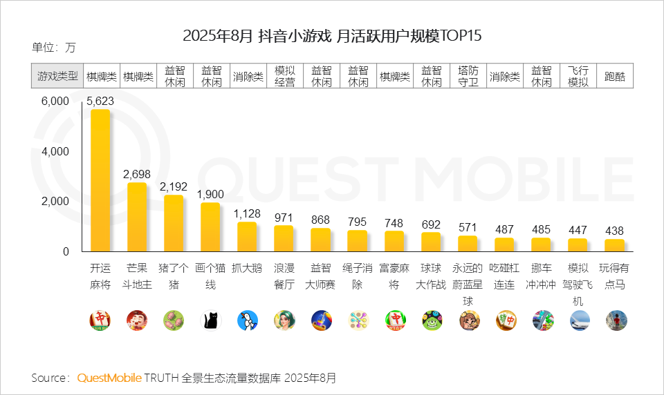 QuestMobile数据显示,2025年8月,抖音小游戏中棋牌类、益智休闲等品类表现突出,其中,《开运麻将》凭借5623万的月活跃用户规模领跑抖音小游戏,《芒果斗地主》《猪了个猪》《画个猫线》《抓大鹅》月活跃用户规模均超千万,展现出强劲的用户吸引力。