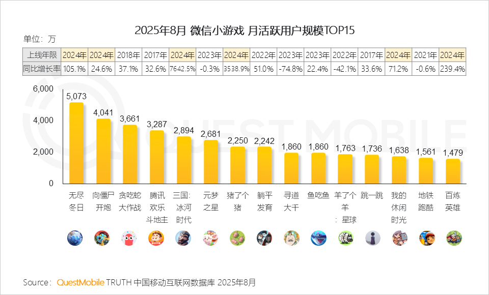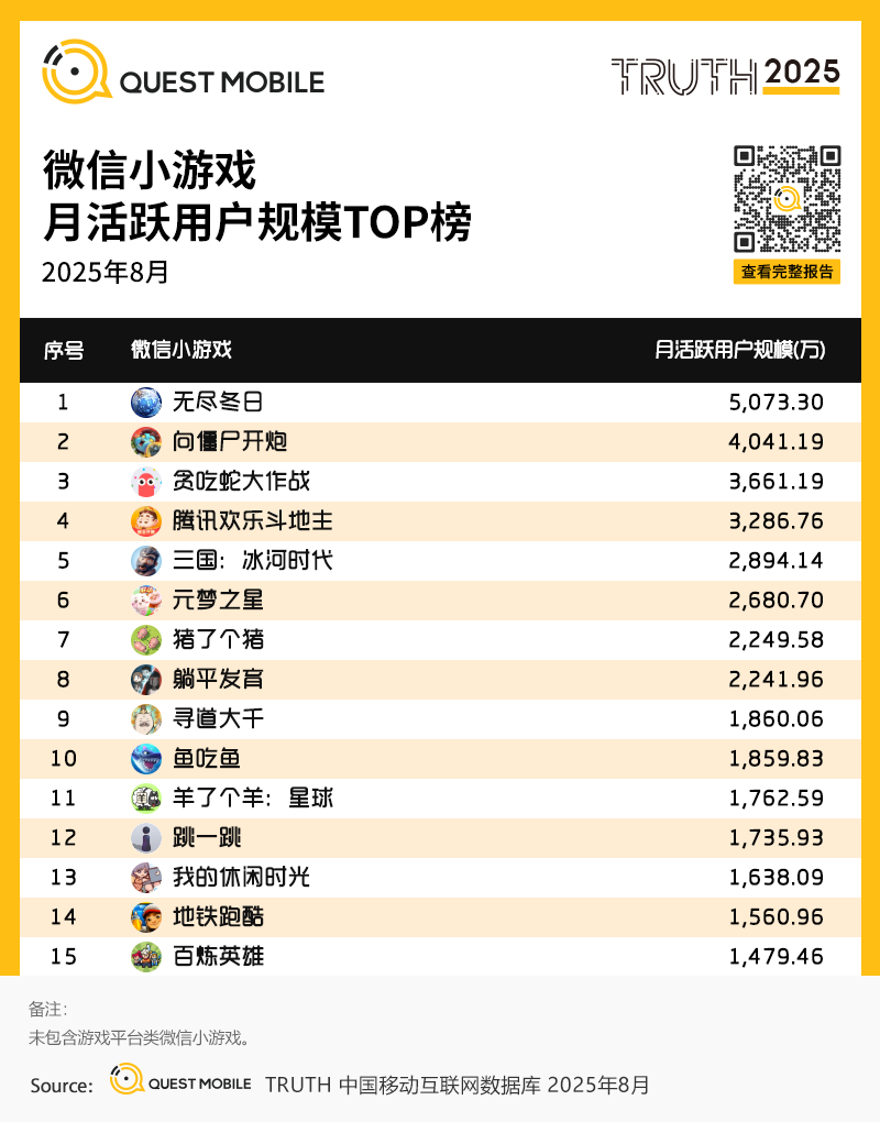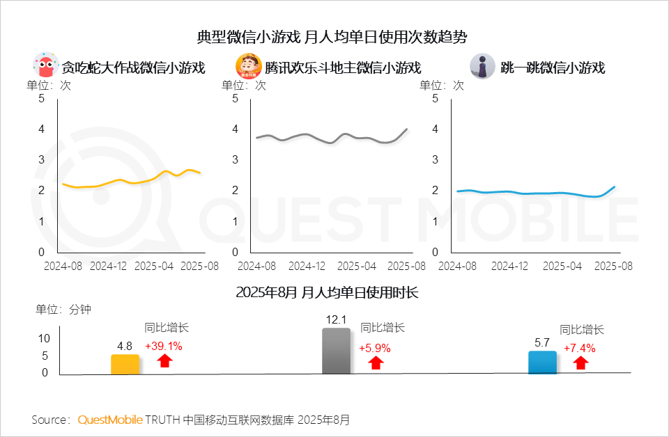 手机游戏APP专注于深度沉浸体验,满足用户长时间高质量娱乐需求,QuestMobile 2025年8月数据显示,手机游戏APP行业人均单日使用次数和时长分别达到23次和114.4分钟;微信小游戏则以轻量化、碎片化特点,提供便捷快速的游戏体验,两者互为补充,满足了用户在不同场景下的多样化需求。