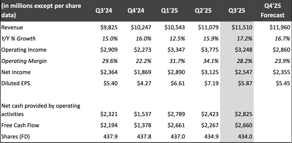 当地时间10月21日,美国视频流媒体服务提供商Netflix公布了该公司的2025财年第三季度财报。报告显示,Netflix第三季度营收为115.10亿美元,与去年同期的98.25亿美元相比增长17.2%;净利润为25.47亿美元,与去年同期的23.64亿美元相比增长7.7%;每股摊薄收益为5.87美元,与去年同期的5.40美元相比增长8.7%。